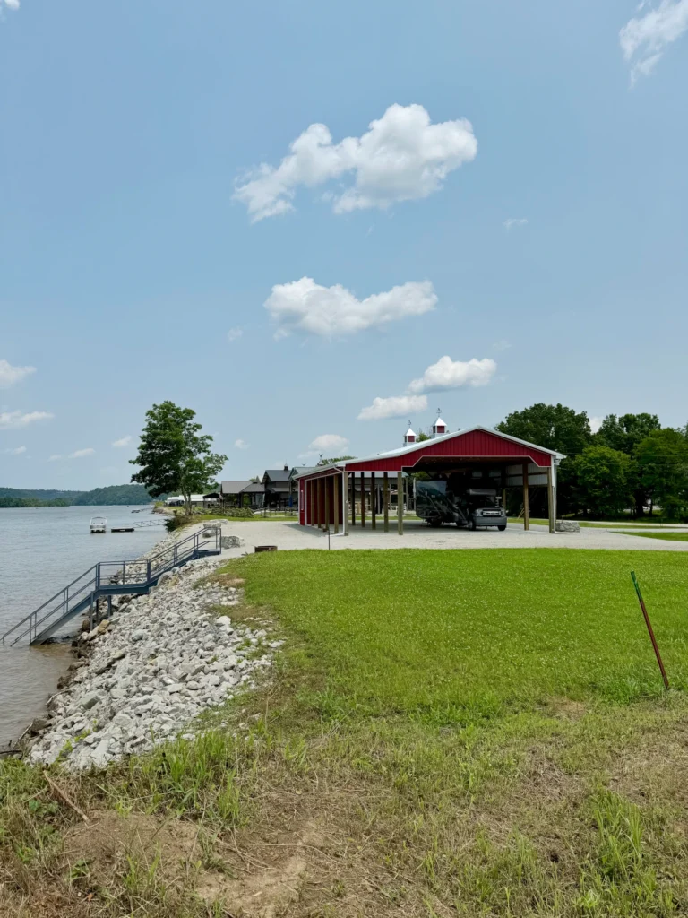The waterfront A lot for 214 A is .300 acres. This site has a septic system in place, 30 and 50 amp electric, and a city water tap. There is fiber high-speed WiFi available in the community. This site sits on a cove with quick and easy access into the main channel of the TN River. This is the perfect site for privacy and easy access into the water to fish, kayak, standup paddle board, or swim right from your site. The view of the water and trees is so peaceful. The large shade trees on this site are so nice to keep you cool in the summer. You can have RVs, tiny homes, and tents on this site. A RV pavilion is allowed. There is plenty of room for multiple RVs. This site has a custom-built picnic table and stone fire pit. You can put a dock on this site and pull your boat right up.
